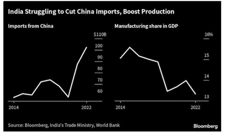 **應訴建議:**歷屆印度政府都強調促進國內製造業發展的政策,以減少印度的進口依賴並增加其在全球出口中的份額。莫迪政府提出“印度製造,為世界製造”(“Make in India, Make for the World”)的口號,極力鼓勵對印度製造業的投資。印度原本計劃在2022財年之前將製造業佔GDP的比重提高到25%。然而,到2022年,印度從中國的進口額達到1020億美元,製造業佔印度GDP的比重已從2015年的16%下降至13%左右3,印度始終無法擺脱對中國產品的依賴。目前,印度政府將製造業佔GDP的比重提高到25%的目標延遲到2025財年。