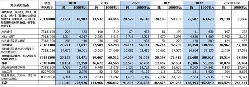 **涉案規模:**根據中國海關數據,印度從中國進口涉案產品在2021年開始大幅攀升。在2020年之前進口金額不超過2.7億美元。在2021年開始進口金額第一次突破到3.24億美元,在2022年,印度進口自中國的涉案產品高達4.52億美元。在2023年,中國涉案產品進口金額也維持在4億美元的水平。須要指出的是,印度的海關税則號和中國的海關税則號有一定的差異。且印度調查機關並未提供涉案產品描述,只是18種緊固件和釘材一一列出。因此,此次調查確切的涉案規模目前無法統計。