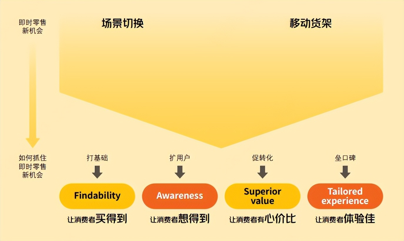 F(Findability買得到),是指品牌可以通過打好供給基礎,打造覆蓋範圍更廣、商品選擇更精的移動貨架;A(Awareness想得到),需要品牌更立體地刻畫消費者,通過場景打造,激發消費需求,拓展用户;S(Superior value心價比),通過提升商品價值感,降低用户決策門檻,促進轉化,加速供需匹配;T(Tailored experience體驗佳),通過商品共創、履約體驗升級等形式不斷提升消費者即時零售購物體驗。