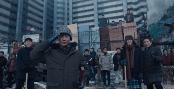 在金永卓帶領安防隊,每次冒着生命危險走出公寓,尋找食物時,他們也會高喊口號: