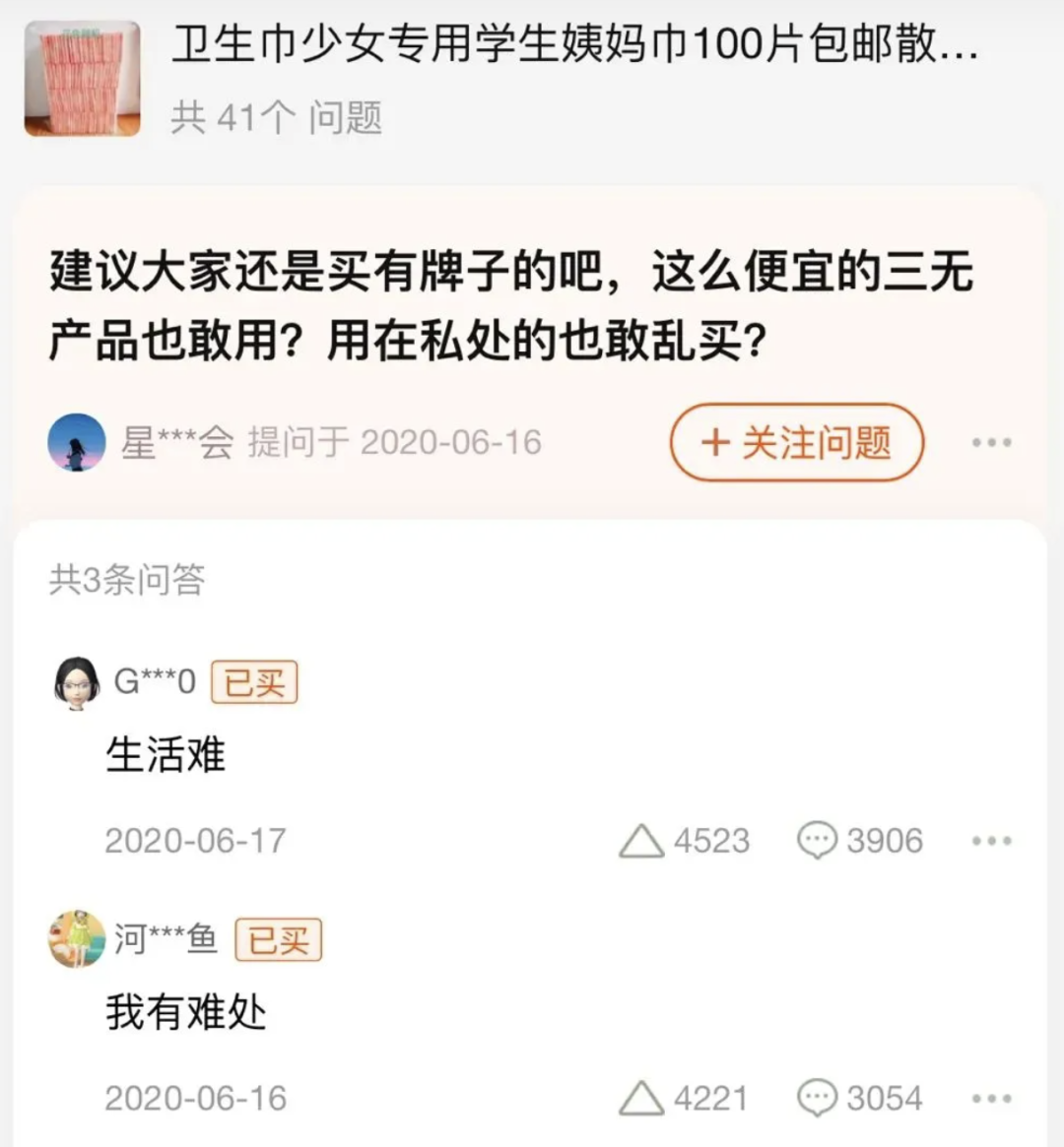 明明散裝衞生巾商品的評論區裏,還有人説自己不買品牌產品,是因為有生活難處。