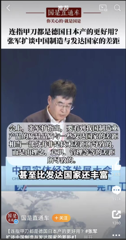 比如圖裏這種覺得中國指甲刀製造都不如德國的觀點(實際上德國指甲刀都是中國製造在中國生產),是因為我們國家的韌性,潛力與真實的實力,依然是被大多數人所低估的。經過四十多年披荊斬棘,篳路藍縷的艱難工業歷程的長途跋涉,中國早已成長為第一工業國,雖然已經具備了這種傲視全球的生產力,許多人還覺得中國不具備的技術才是高科技,隔岸觀景反倒覺得自己的問題比別人嚴重。但生產力是0和1的問題,每一個大的經濟體國家能否化解所遇到的危機,諸如金融,分配,就業,服務業規模都和物質生產力的發達程度休慼相關。只有小國可以僅靠資源過好日子但代價是抱對大腿並依附於大國的生產力,而大國的生產力越發達,越有辦法化解金融上的種種難題。日本失去的三十年,淺層是房地產和金融問題,深層上是不能獨立自主,物質生產力的賽道和上限被鎖死了,錯過了手機互聯網工業革命,高端芯片生產,新能源車這些先進物質生產賽道,讓房地產和金融問題根本無法得到有效化解。因為製造業才是社會經濟活動的基石。
