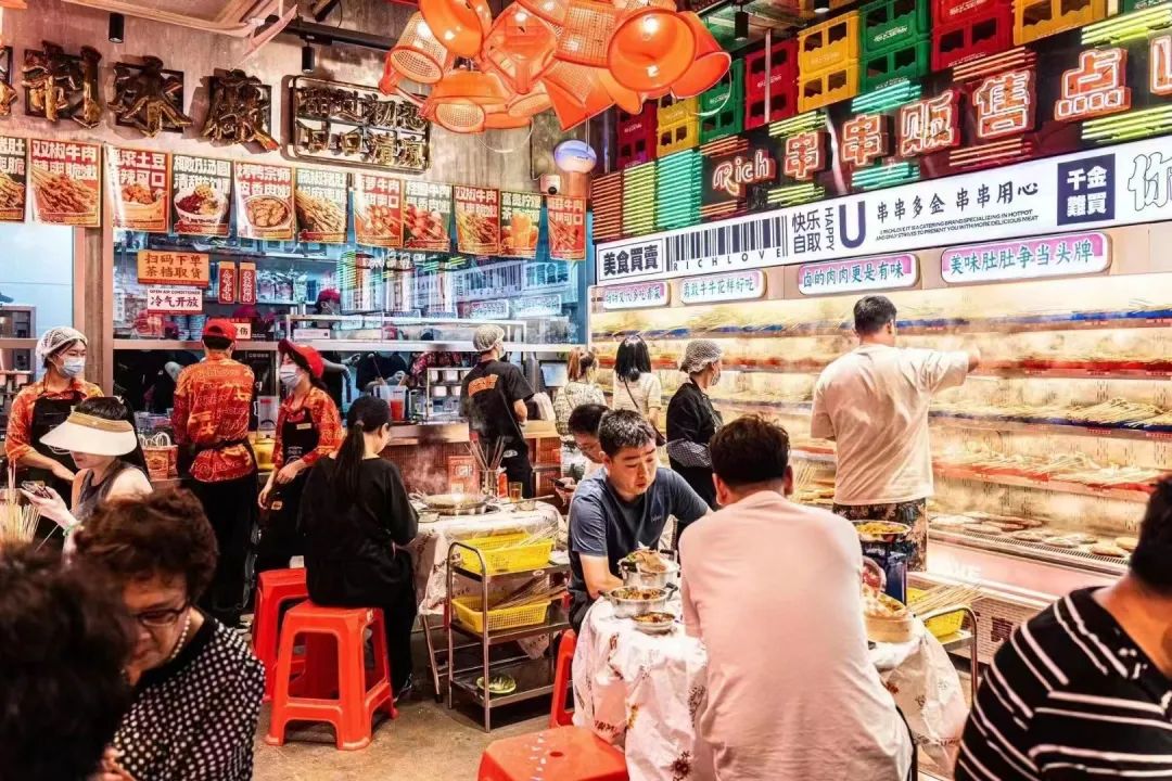 8月份在成都開業的城都吃客大排擋串串香,就是是市井+大排擋風,壩子裏食客觥籌交錯、肆意説笑,好不熱鬧,一面是熟悉的市井風貌,一面是東方魔幻場景,將市井味道、國潮美學精妙結合。