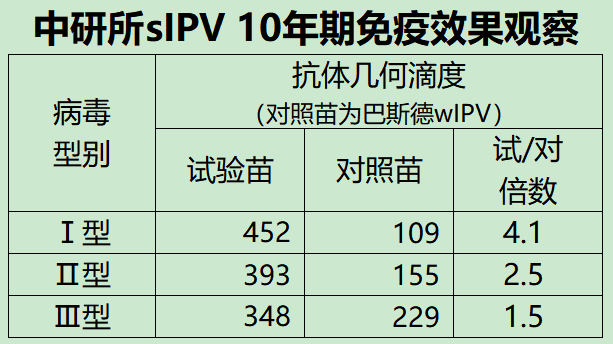 可以看到,10年後sIPV的抗體水平也是全面超過wIPV。按此趨勢推斷,20年後大概率也是如此,頂多就是持平,不可能出現sIPV的抗體水平低於wIPV的情況。