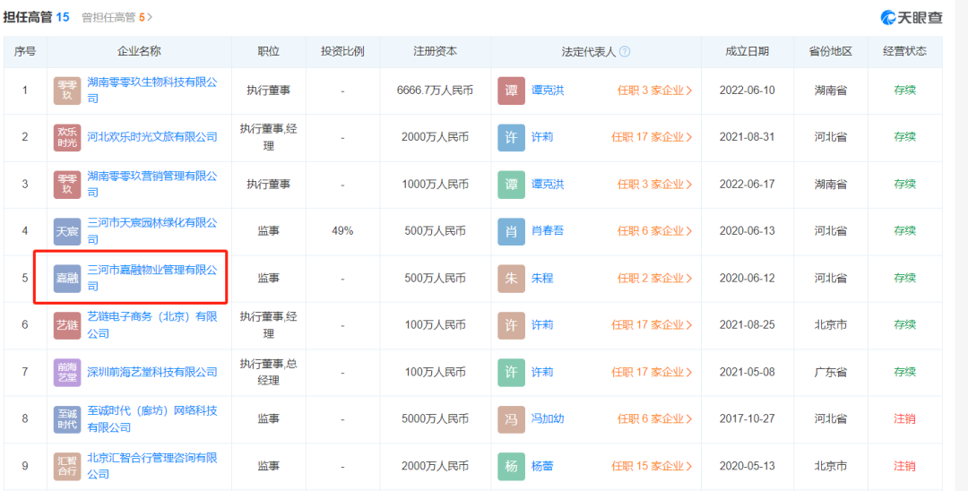 此外,許莉還任天洋控股旗下三河市嘉融物業管理有限公司監事、並曾擔任天洋控股旗下三河市夢東方文化投資有限公司監事。