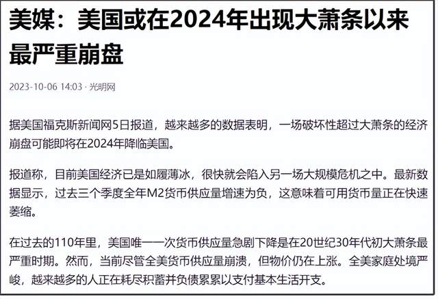 10月5日,美國福克斯新聞網就寫得比較嚇人,説美國或在2024年出現大蕭條以來最嚴重崩盤。