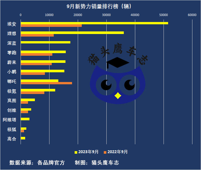 據貓頭鷹車志不完全統計,以埃安、“蔚小理”為代表的10幾個造車新勢力品牌,9月份新車銷量普遍增長明顯。