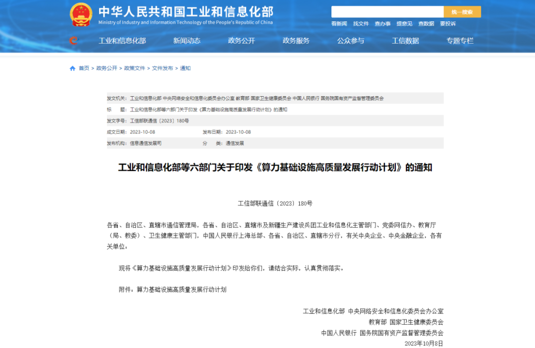 2023年10月8日,工業和信息化部等六部門印發**《算力基礎設施高質量發展行動計劃》**。