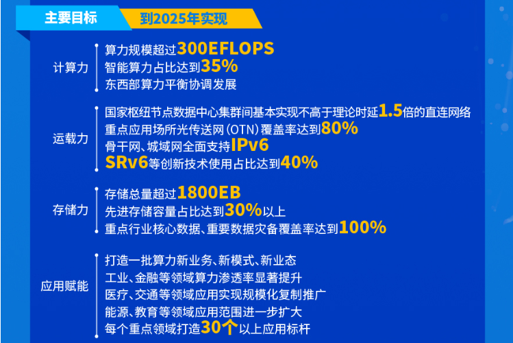 如算力規模超過 300 EFLOPS,智能算力佔比達到 35%,重點應用場所OTN覆蓋率達到 80%,存儲總量超過 1800EB,先進存儲容量佔比達到 30%以上,重點行業核心數據、重要數據災備覆蓋率達到100%,每個重點領域打造 30 個以上應用標杆等。