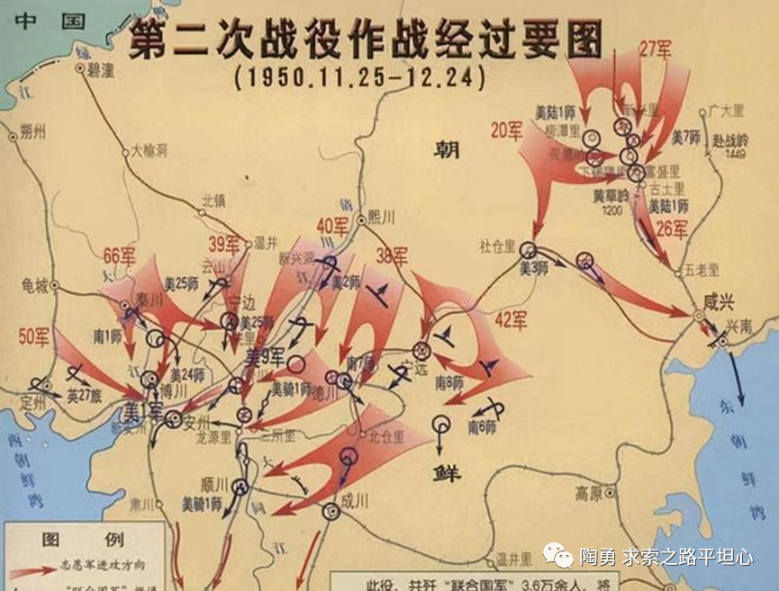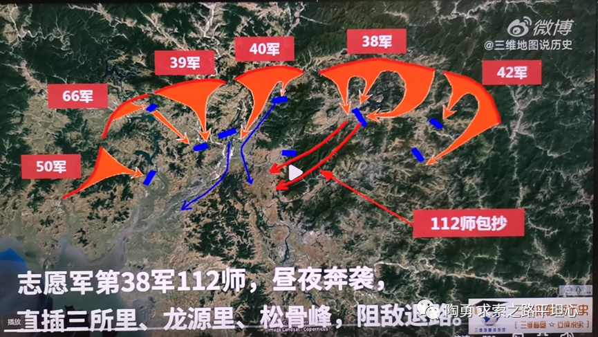 志願軍實際固守在松骨峯主峯下面的山包上,藍色線條箭頭為美軍第二師潰逃路線。**三連最後打得還剩九人,美軍停止進攻。但如果打沒了,其他部隊會補上,這個在軍事上叫“添油戰術”。