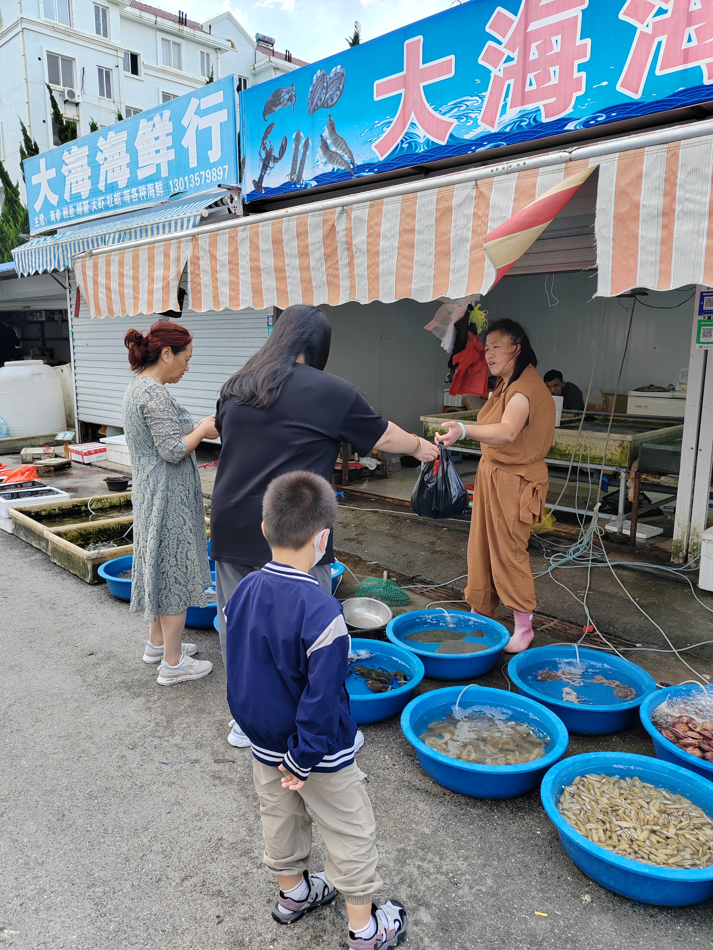 出了小區往西去有早市和賣海鮮的,因為乳山銀灘到處是外地人,附近的物價不底,跟濰坊的海鮮價格差不多。你想想人家京爺還能差錢,趕早市看着人家都是一麻袋一麻袋的買。我感覺乳山這邊的花生和大蝦比濰坊買的好吃。這裏的花生是沙土花生,紅皮的比白皮的好吃,煮出來發甜,粒也飽滿,4塊多1斤。35一斤的大蝦煮出來也發甜。是不是離海邊近,沒加黑科技。還有就是買東西靠運氣,我們就在早市第一天買到了紅皮花生,之後都是賣白皮的。大蝦也是今天撈上來大的,明天可能就沒那麼大,遇到大風大浪的天,集市上可能沒有賣蝦的。