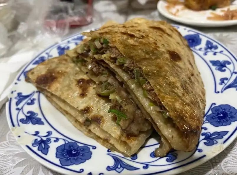 哈記肉餅另一個拿手絕技是皮比餡更好吃。麪皮是帶點燙麪的半發麪,沒有死麪那麼不容易咬斷。老式鐵鐺燒得火燙,刷上幾滴油,小火烙出來的餡餅皮被汁水連湯帶油吸得飽滿豐潤,趁熱咬上一個小口,流出來的肉汁滴滴答答,吃得叫一個酣暢淋漓。