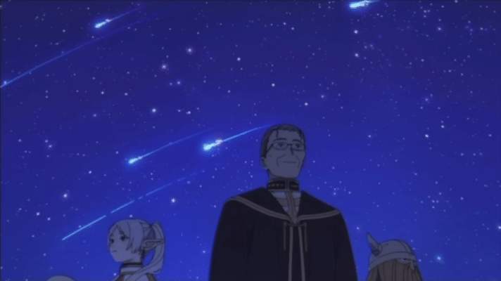 慶功宴上勇者一行人欣賞着50年一遇的流星雨,勇者辛美爾、僧侶海塔和戰士艾澤感慨着10年的漫長旅途,而作為長生種的精靈魔法使芙莉蓮卻無法共情,平淡的説出了“下次,50年後,我知道個看的更清楚的地方,到時候帶你們去。”
