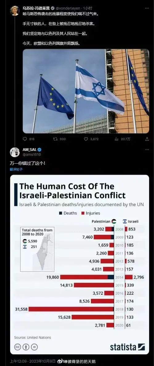 自2008年以來,已有15萬名巴勒斯坦人被以色列打死打傷,其中33000人是兒童。此前馮德萊恩聲援以色列時,被網友用數據打臉。