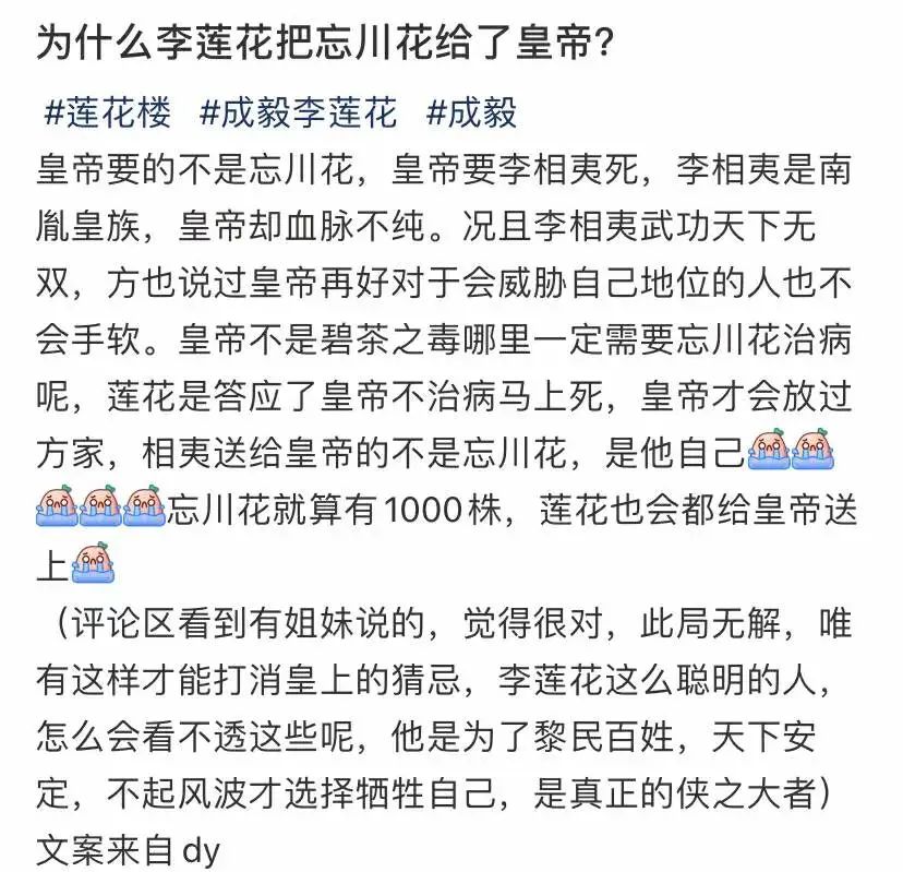 而最令原作黨難頂的,除了原創的主線外,最重要的是編劇自以為的“題材昇華”——男主李蓮花將自己的救命靈藥忘川花獻給皇帝解毒。
