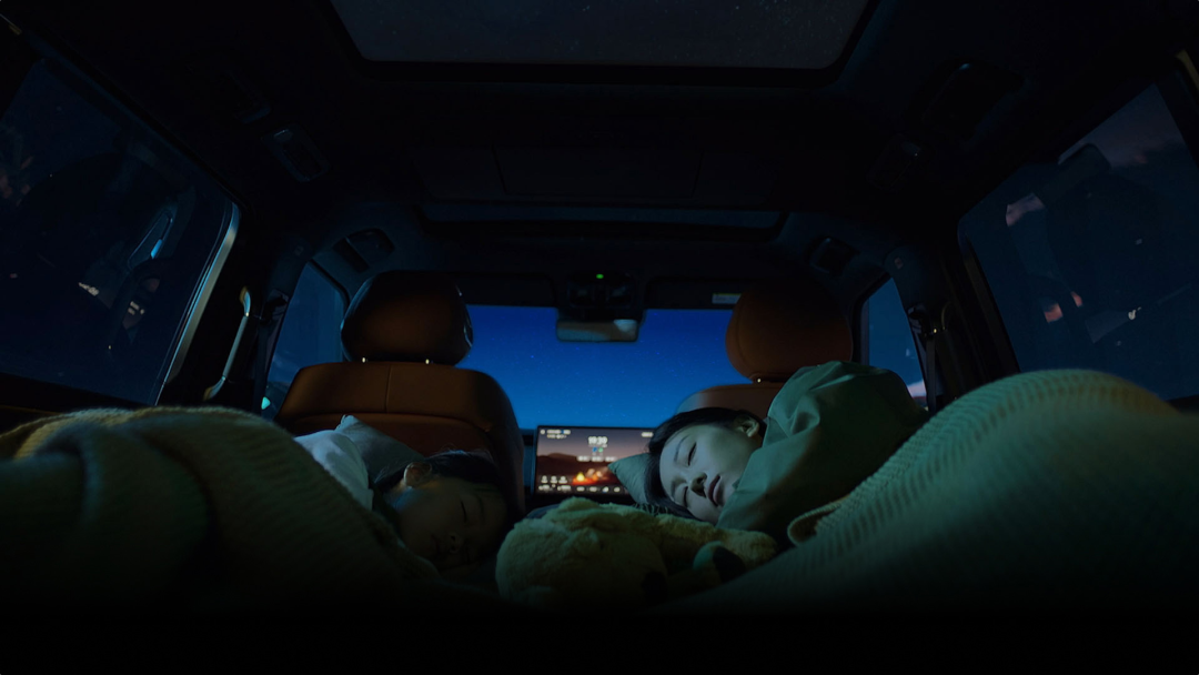 一室:後兩排放倒,搭配官方定製牀墊,變身 2m × 1.3m 大牀卧室。