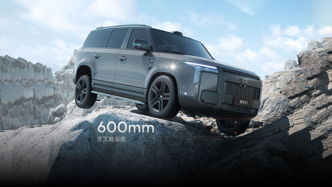 在外觀設計上,極石 01 捨棄了新能源車常用的低風阻圓潤造型,反而用上了大量直線條,希望用硬派越野外形和市面上的競品打出差異化。乍一看確實挺硬派、挺越野的,就是線條有點致敬路虎衞士。