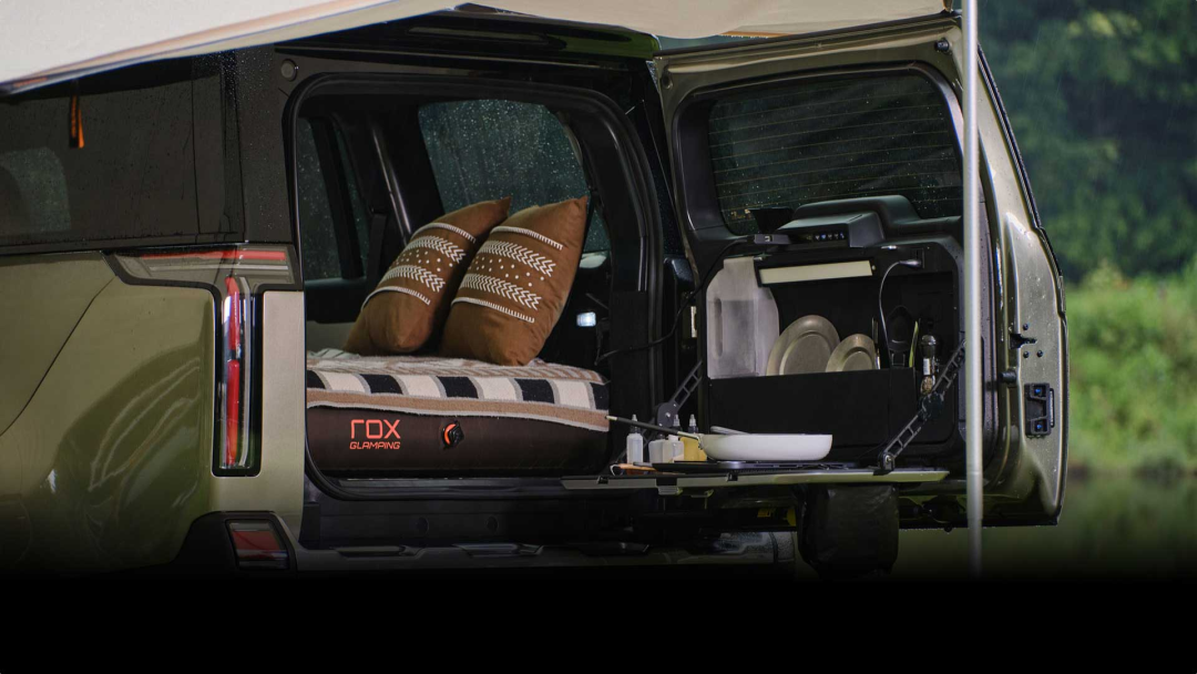 一廚:官方定製車尾餐廚系統,打開尾門就是小廚房。餐具、廚具,操作枱、小桌板一應俱全, 2.2 千瓦對外放電也剛好夠接電磁爐,還自帶即熱飲水機隨時供應熱水。