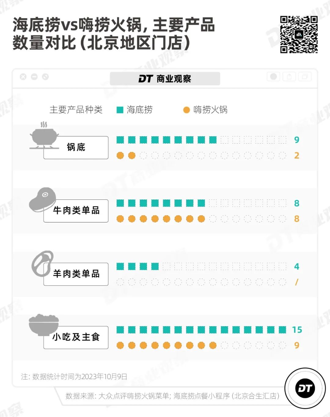 而根據海底撈點餐小程序,同地區的海底撈門店,除了牛肉類單品外,還有鮮切羊肉、新西蘭羔羊羊排卷、內蒙草原羔羊肉、內蒙特色沙葱羊肉卷這4大羊肉單品。同時,光是毛肚這一單品的種類,海底撈就比嗨撈火鍋多出2種。