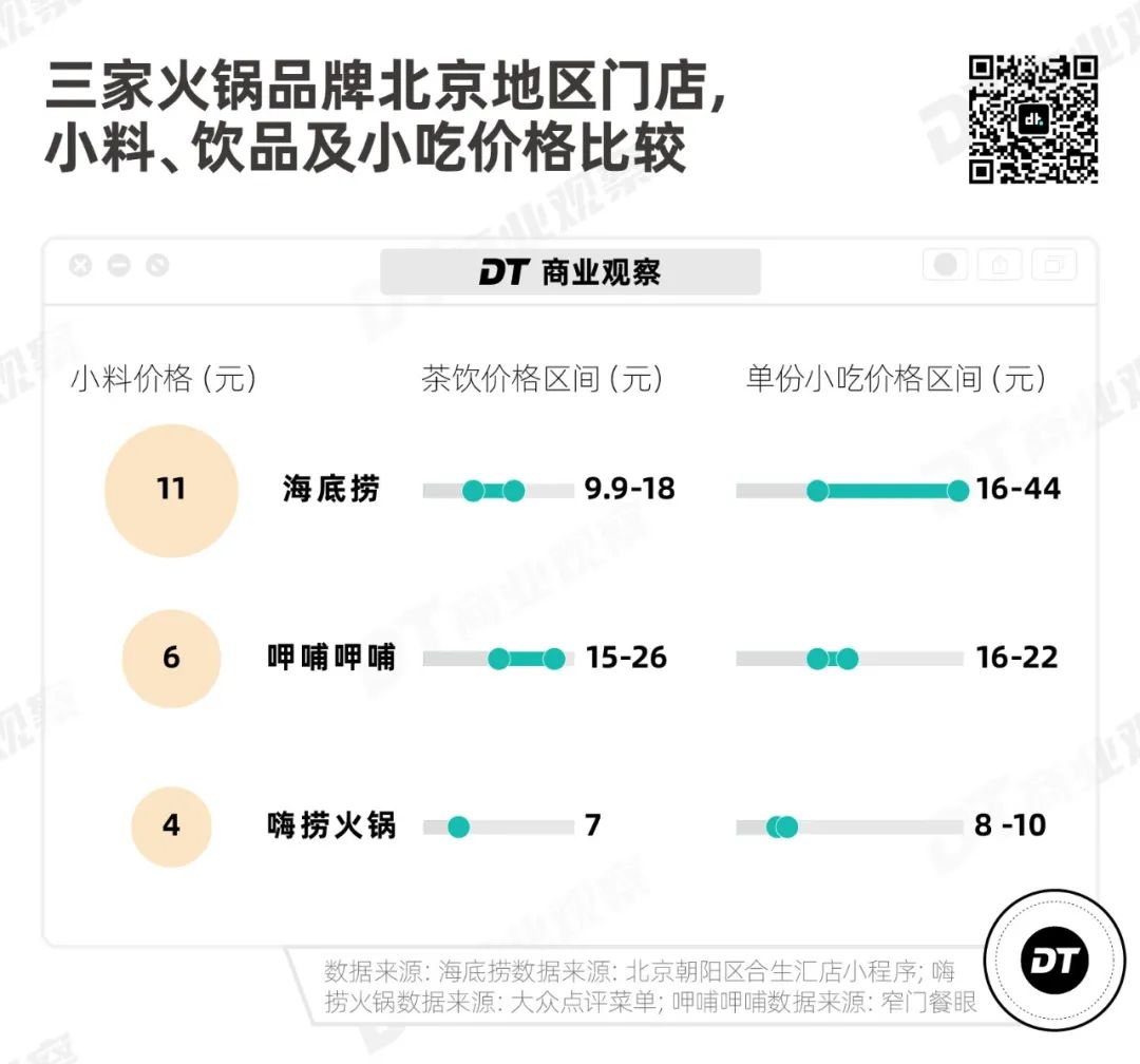 而嗨撈火鍋4元的小料、7元的茶飲、以及低至8元起10元封頂的小吃,都是三家火鍋品牌中最具有價格競爭力的。