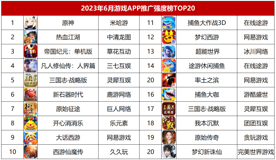 據AppGrowing的數據顯示,2023年4月,《原神》首次出現在遊戲APP推廣強度榜TOP 20中,主打的是“新人送20抽”“原來你也玩原神”的情感觸達,到了6月首次登頂榜首,之後一直是榜首的有力競爭者。