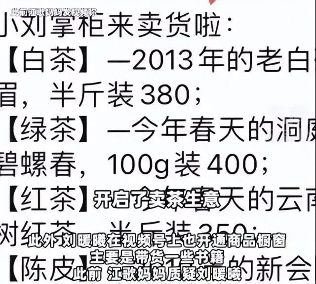 此前,江歌媽媽曾公開質疑劉暖曦利用江歌案的熱度在粉絲羣裏賣茶葉。“劉暖曦又利用江歌被害事件積攢人氣,開啓了賣茶生意。”