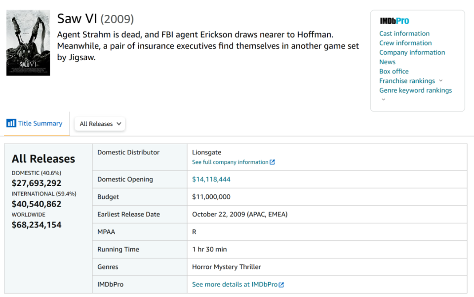 不過2009年的《電鋸驚魂6》成為轉折點,北美收益大幅下滑至2769萬美元,全球更首次掉到1億美元之下;即便投資回報比依舊超過6倍,但這一系列明顯已觸及天花板。