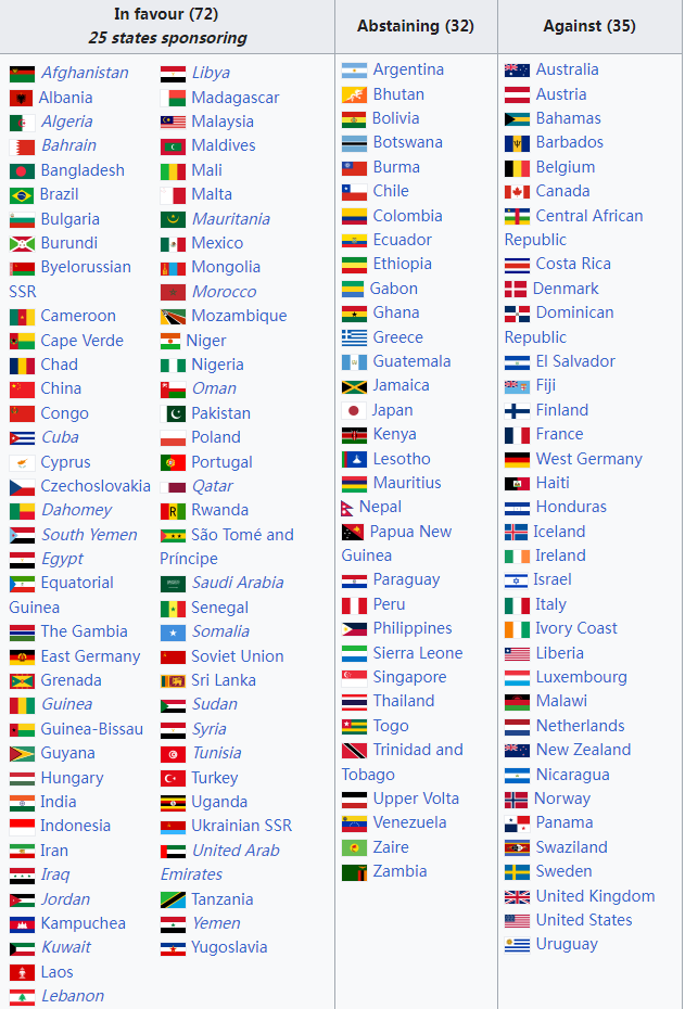約一年後,聯合國大會3379號決議於1975年11月10日以72票對35票(32票棄權)通過,“確定猶太復國主義是種族主義和種族歧視的一種形式”。