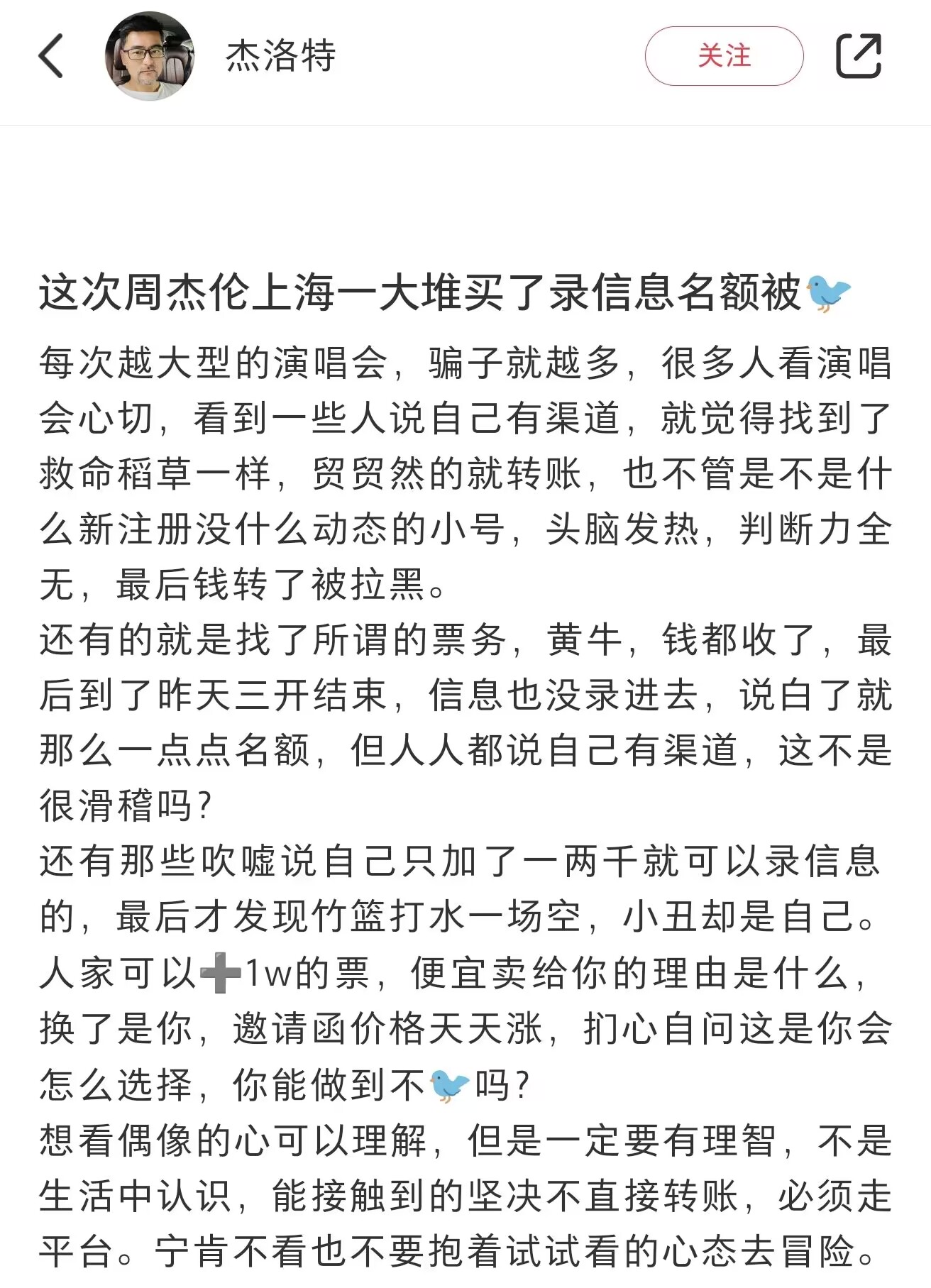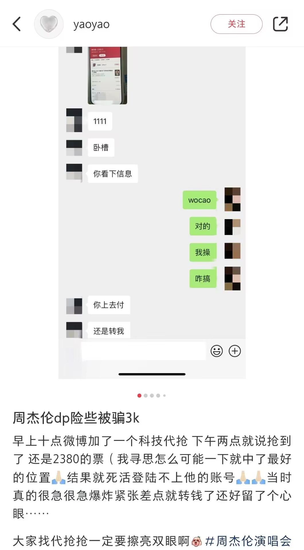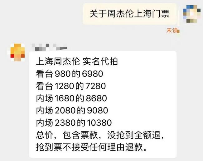 無論是代拍還是邀請函,被騙的風險還是很大的,最壞的情況是騙子捲款跑路,稍好一點的情況是最終收不到票,像這次周杰倫演唱會,就出現了很多付了錢給黃牛之後,對方就把客户鴿了的事情。