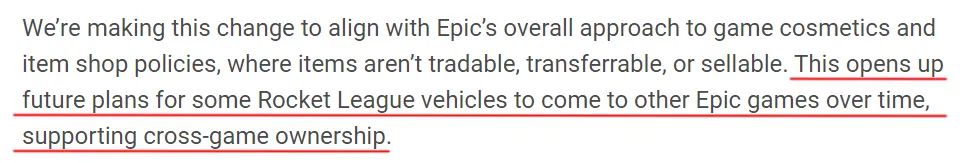 比起來,《火箭聯盟》的交易市場要平淡得多,還從未沒有出現過任何值得一書的交易事故。在這種情況下,官方仍然執意取消玩家交易功能,導致不少玩家認為,此項改動的主要目的是徹底扼殺玩家社區的交易市場,控制貨幣與商品價格,從中獲取更多利潤。