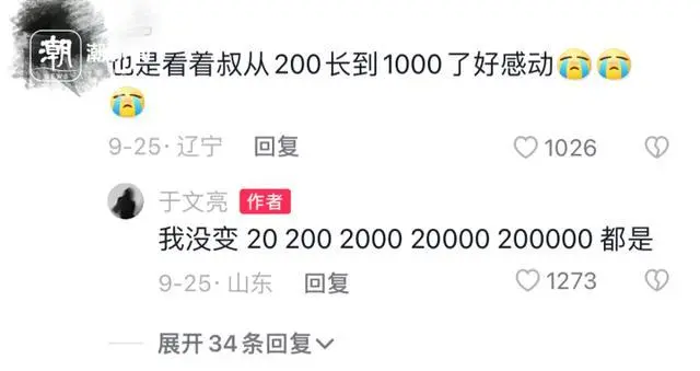 潮新聞記者翻看於文亮最早的幾條視頻,注意到在9月25日,一位網友留言“看着叔從200長(漲)1000了好感動。”於文亮當時的回覆是,“我沒變,20,200,2000,20000,2000000都是。”
