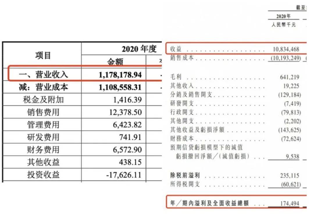2021年6月21日,夢金園在深交所主板遞交的招股書中,公司2020年的營業收入為117.82億元,而在港交所遞交的招股説明書中,營業收入變為了108.34億元,相差將近10億元。