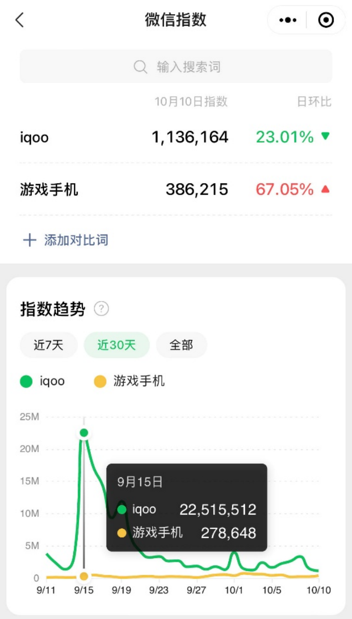 比如,當iQOO 11S官宣成為杭州亞運會電競賽事官方用機後,這個vivo的子品牌再次被大眾重新認知。近30天微信指數顯示,iQOO相較於遊戲手機一直處於高位,在9月15日達到頂峯。