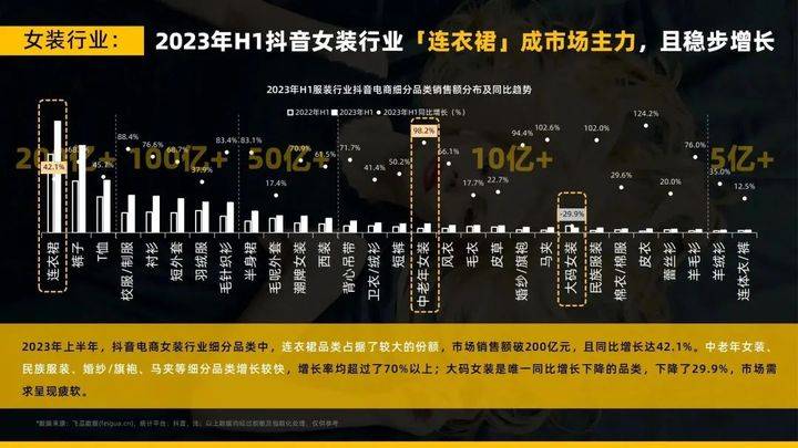 隨着時代的發展,女性的時尚需求也在不斷地變化。而在時尚界中,連衣裙一直是女性最為喜愛的服飾之一,已成為了女性服裝市場的一大亮點。連衣裙市場一直是時尚產業中最具活力和競爭力的領域之一,2023年H1抖音電商連衣裙市場銷售額超500億元,已形成了一個龐大的產業;