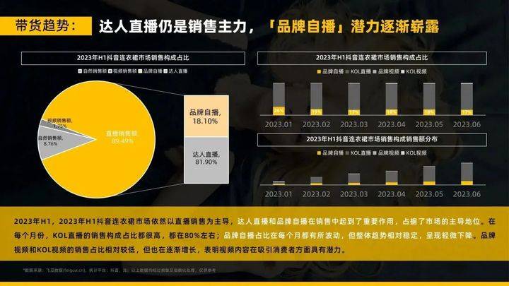 2023年H1,2023年H1抖音連衣裙市場依然以直播銷售為主導,達人直播和品牌自播在銷售中起到了重要作用,佔據了市場的主導地位。在每個月份,KOL直播的銷售構成佔比都很高,都在80%左右;品牌自播佔比在每個月都有所波動,但整體趨勢相對穩定,呈現輕微下降。品牌視頻和KOL視頻的銷售佔比相對較低,但也在逐漸增長,表明視頻內容在吸引消費者方面具有潛力。