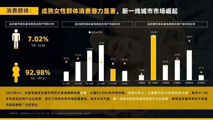 2023年H1,抖音電商連衣裙市場的主要消費羣體是女性,佔據92.89%的市場份額。年齡分佈上,主要集中在24歲到40歲之間,其中31-40歲年齡段的用户佔比較高,顯示了成熟女性市場的重要性。城市分佈方面,新一線城市和四線城市的用户佔比較高,表明連衣裙市場在不同城市層級都有廣泛的受眾。
