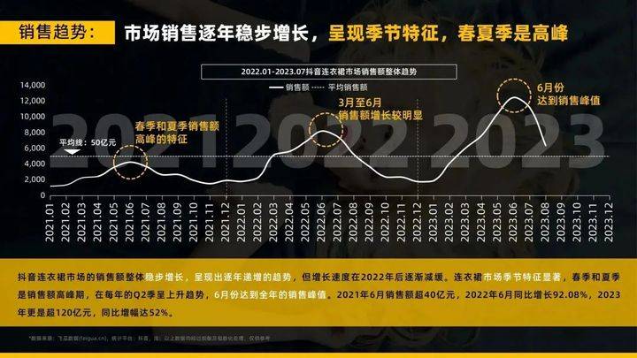 抖音連衣裙市場的銷售額整體穩步增長,呈現出逐年遞增的趨勢,但增長速度在2022年後逐漸減緩。連衣裙市場季節特徵顯著,春季和夏季是銷售額高峯期,在每年的Q2季呈上升趨勢,6月份達到全年的銷售峯值。2021年6月銷售額超40億元,2022年6月同比增長92.08%,2023年更是超120億元,同比增幅達52%。