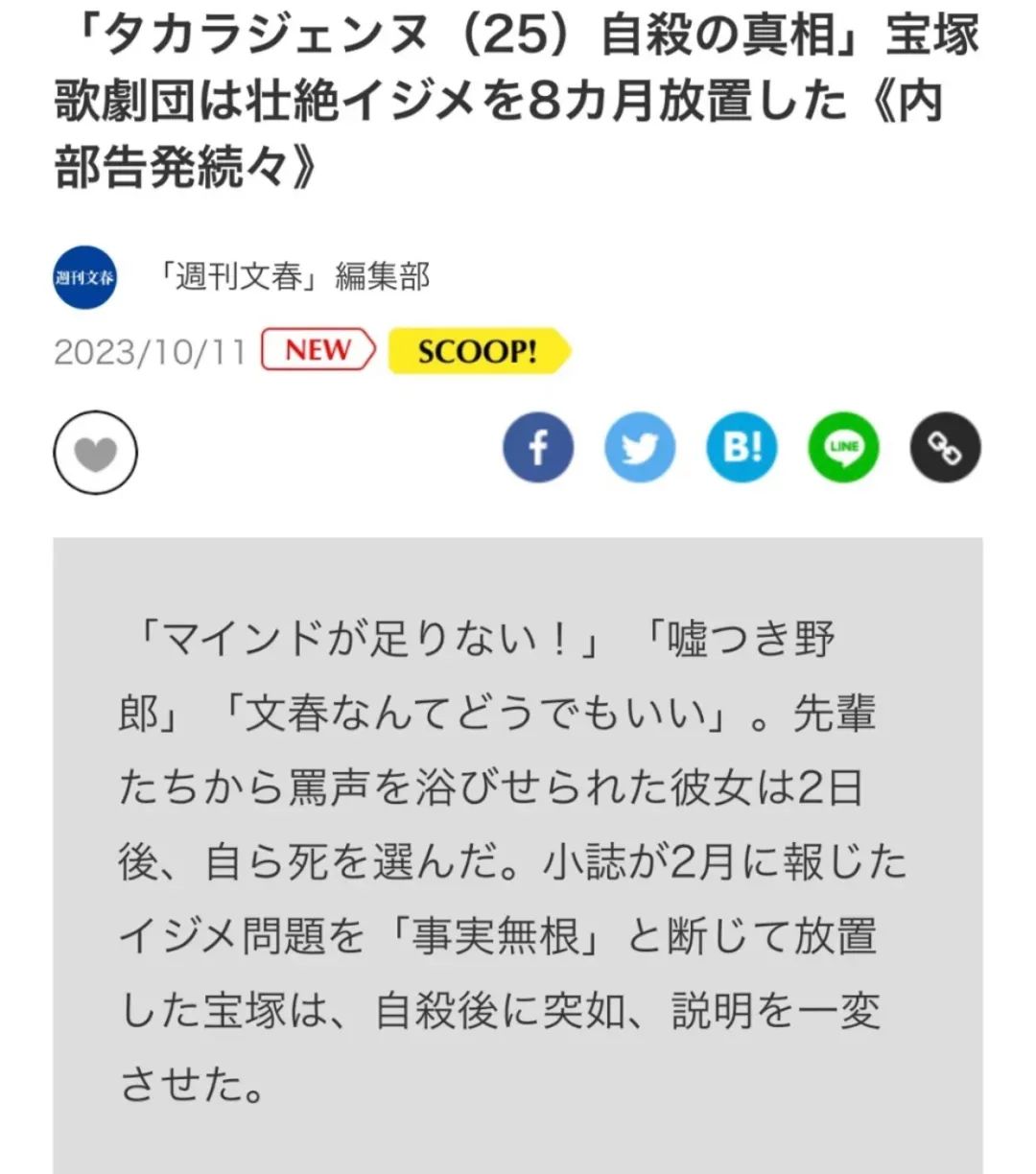 在9月30日有愛離世後,文春卻將責任推到劇團和宙組前輩身上。這位媒體人直言,就是文春間接害死了她。