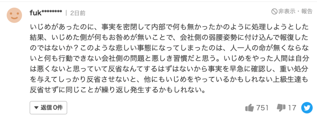 “明明就有霸凌啊,寶冢卻封鎖事實,處理方式就好像內部什麼事情都沒有發生,結果霸凌者沒有得到任何責備或者懲罰,霸凌者是不是就看準這點,利用寶冢軟弱的態度進行變本加厲的報復?現在事情變成了如此悲慘,一個人失去了生命卻不能改變公司長久以來的問題和壞習慣、霸凌者仍然認為自己沒有錯、自然就不會反省。因此要儘早理清事實,給予霸凌者沉重的處分。不好好反省的話,其他正在霸凌別人的上級生同樣不會反省,類似的事情依然可能會重演。”