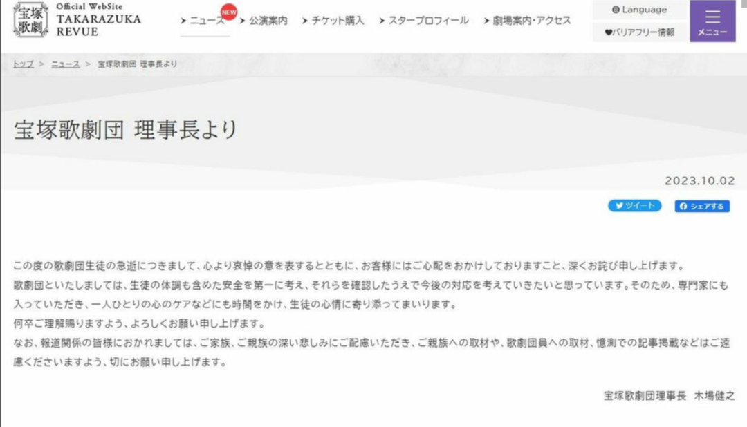 10月2號,寶冢以理事長木場健之的名義,在官網上發佈了訃告: