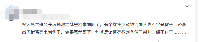 一些網絡流傳的抹黑段子,明顯是老段子翻新,比如所謂典韋在宛城丟了八十斤的戟,井蓋也是八十斤。這種某地人偷井蓋的段子,已經很多年沒人説了。這種輿論傾是很糟糕,卻被掩蓋在輿論狂歡之下。