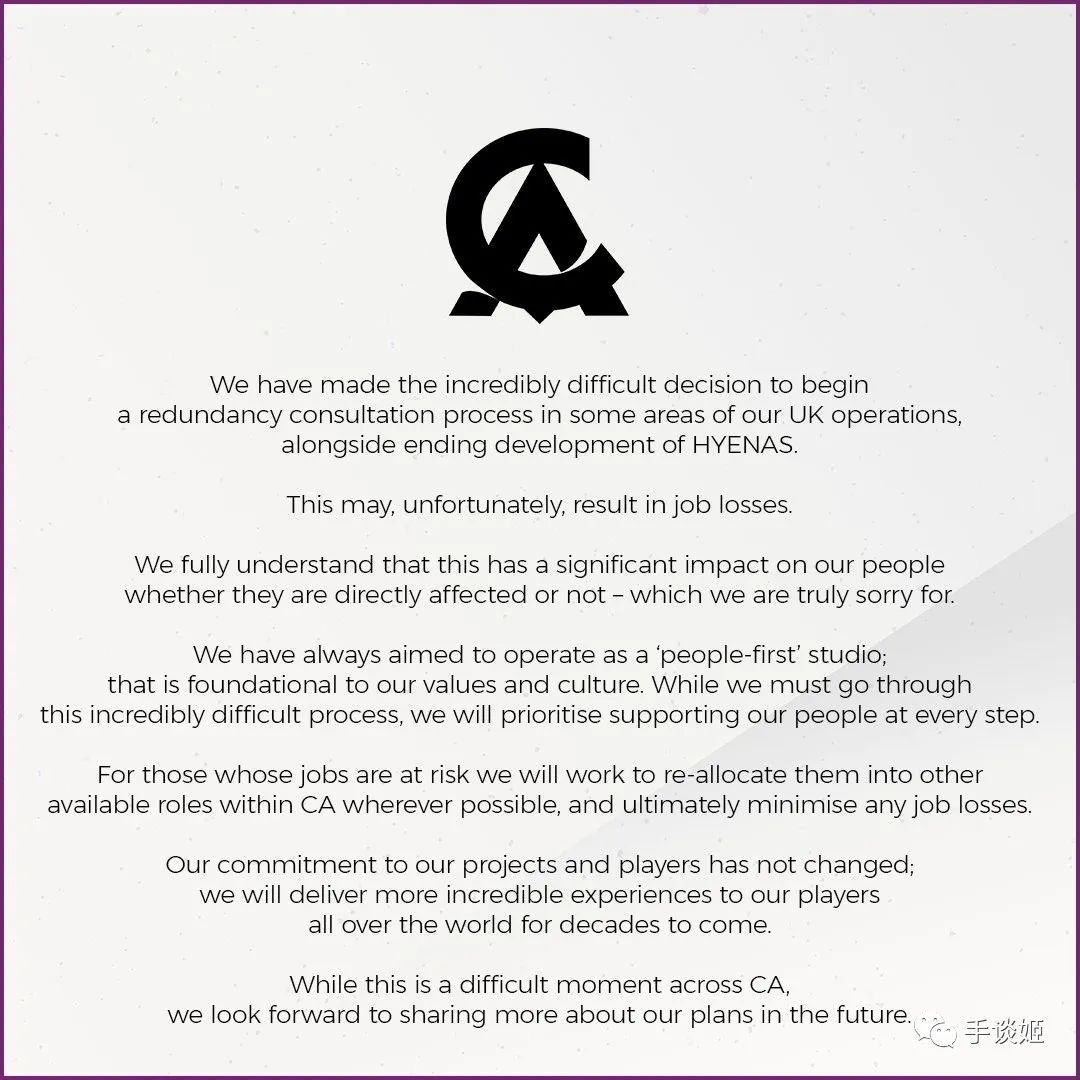 沒想到,9月末,CA官推以及《鬣狗》官推均發佈公告,稱做了一個遺憾的決定,將終止這款遊戲的開發。而且CA還説,不止是《鬣狗》,在英國的部分項目也會進行裁撤。