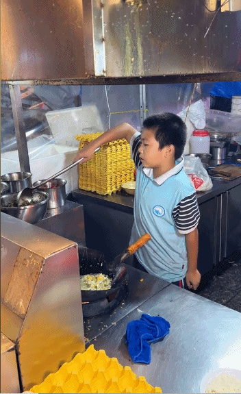 年僅11歲卻已經有了5年的掌勺經驗,老爸在他面前也只能打下手,嘴裏説不愛炒飯但手裏不停,彷彿一邊罵老闆一邊加班的我。