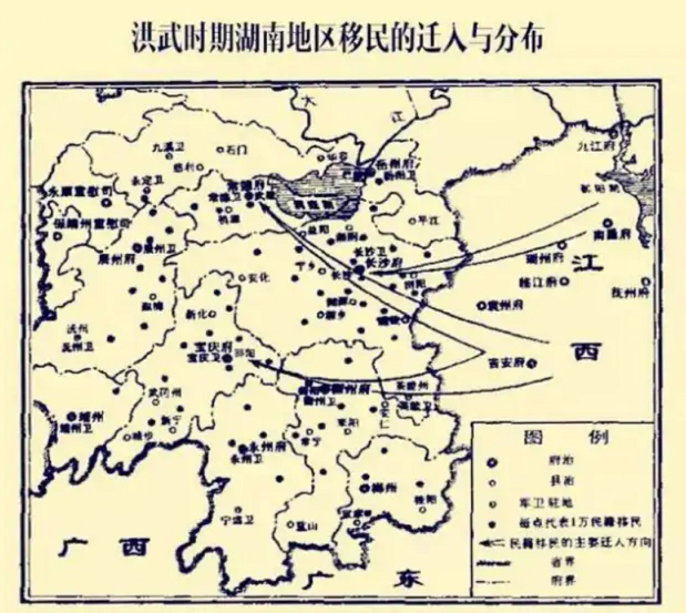 明初洪武年間,以江西居民為主的長江下游人口開始大量向中游地區遷徙。在此次大“遷徙”中,江西本地居民有過半都向湖北、湖南、廣東等地區遷移。“湖廣”作為古代省一級行政區,在明代基本指的是湖北、湖南兩省,而在元代則還包括了廣東、廣西等多地。