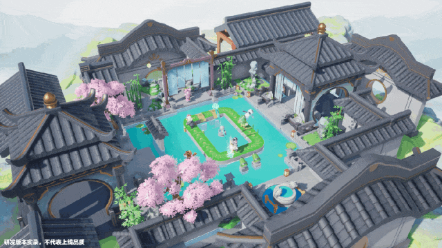 像是競速關“水墨竹筏”和生存關“星寶快跑”,它們都以蘇式園林為設計靈感,地圖中充滿了標誌性的中式建築,場景元件也都以竹筏、荷葉、竹竿等形式呈現,就連經典的大擺錘也換上了青花瓷的樣式。