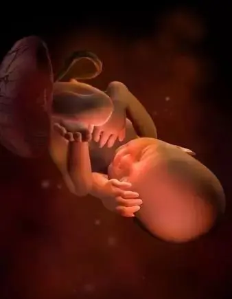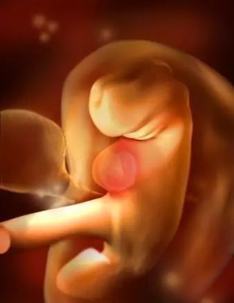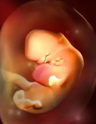 孕8周:腦部發育,胚胎長約有20毫米,器官有明顯的特徵,手指和腳趾間有少量的噗狀物,胚胎的各種複雜的器官都開始成長,牙和齶開始發育,耳朵在繼續成型,胎兒的皮膚很薄,血管清晰可見,胚胎開始有運動。