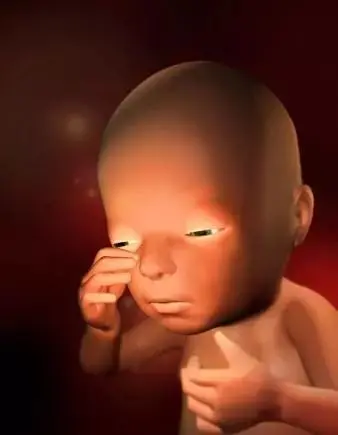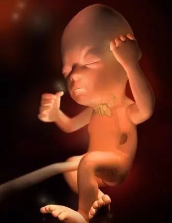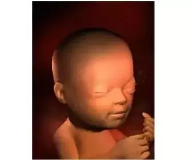 孕16周:胎兒打哈欠,胎兒此時看上去象一個梨子,身長約12~15cm,體重約120~150克,頭部明顯直立,雙眼已經移到了頭部前方,仍然緊閉,但是眼球可以移動;眉毛、睫毛正在生長,耳朵也達到了最終的位置,此時心率約150次/分。