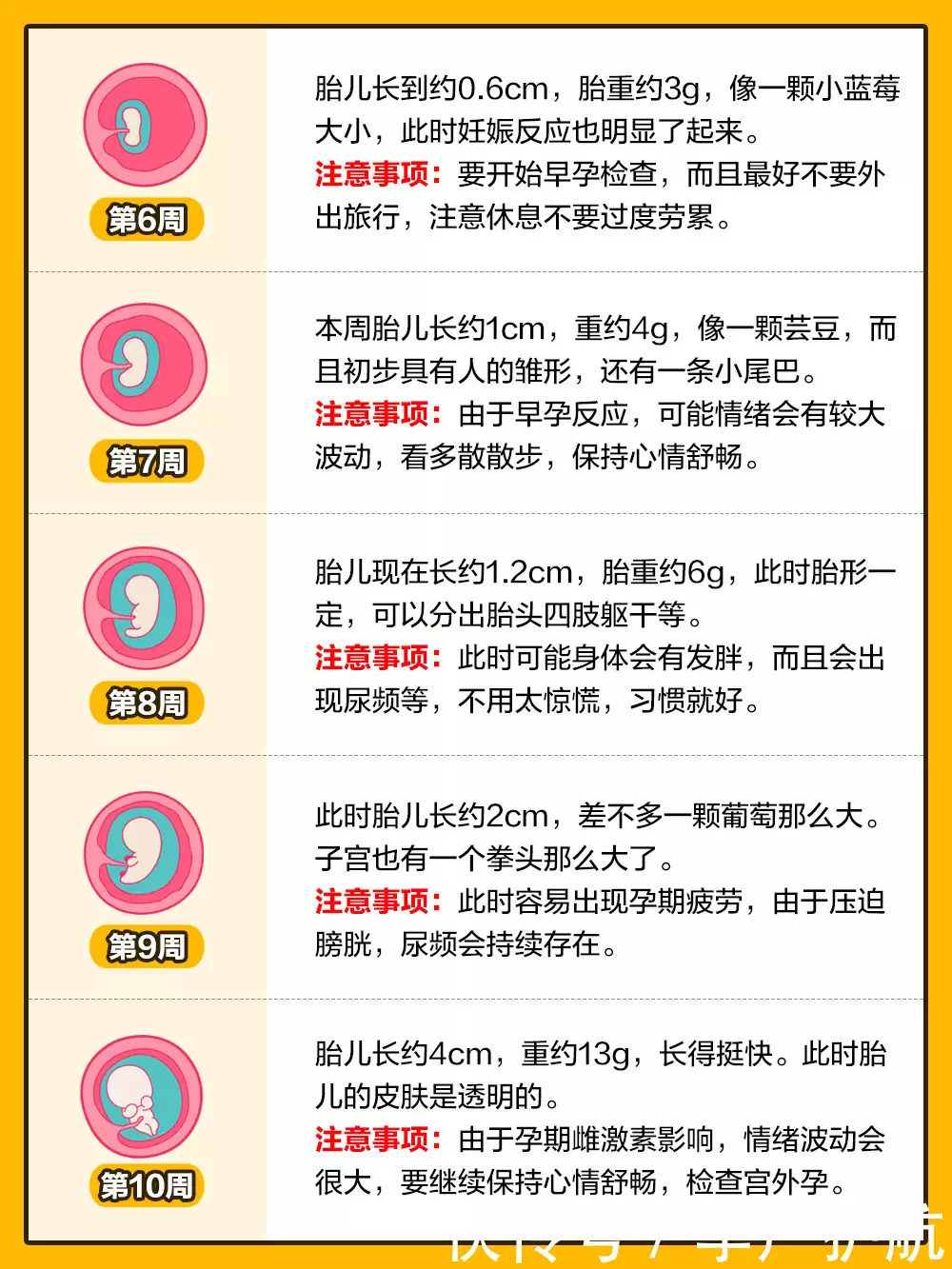 孕6周:心臟發育,心臟跳動,胚胎成長迅速,心臟開始劃分心室,並進行有規律的跳動及開始供血。胎兒的細胞仍在迅速分裂。腎和心臟的雛形已經發育,神經管開始連接大腦和脊髓開始發育。