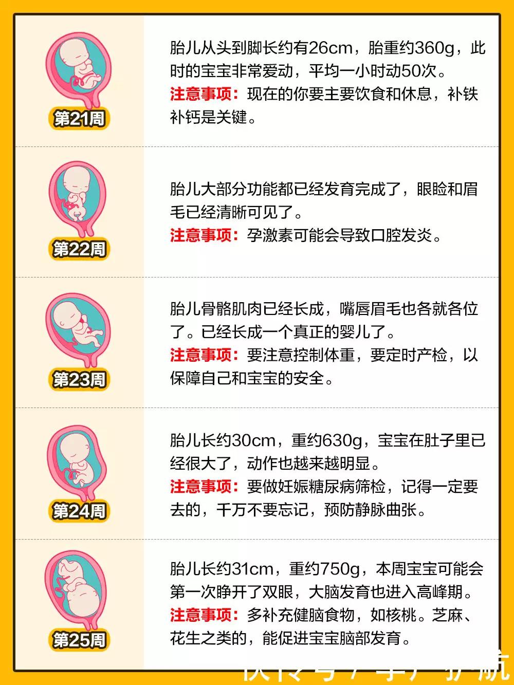 孕25周:胎兒味蕾正在形成,胎兒體重穩定增加,約有570克。皮膚很薄且有皺紋,幾乎沒有皮下脂肪,全身覆蓋着一層細細的絨毛,身體比例較為均稱,胎兒開始充滿整個子宮。