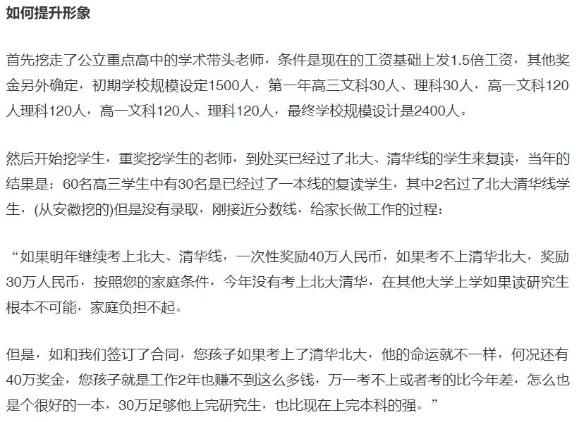 衡中就是產業化超級中學的終極形態,高強度的教學模式、監獄般的管理方法反而只是它最小的惡。所謂“衡中”其實是公立的衡水中學和私立的衡水第一中學(現改名衡水泰華)的聯合體,以合規或不合規的手段掐走了河北省絕大多數的優質生源和師資,憑藉嚴密的壟斷締造了成績居高不下、分校遍地開花、合作企業美股上市的高考產業神話。